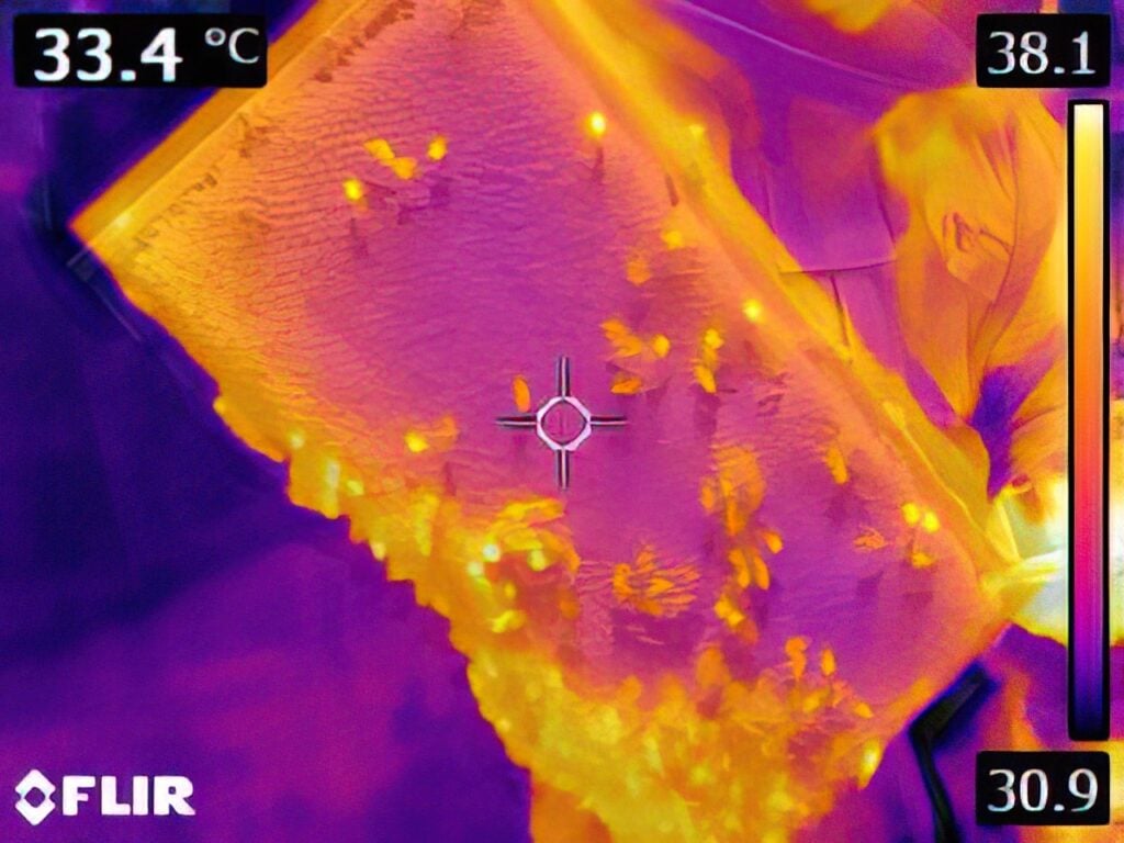 In summer, bees cool down the brood nest by bringing water into the hive that they evaporate through fanning. The centre of the frames around the brood nest is often cooler than the environment. Photo Theotime Colin