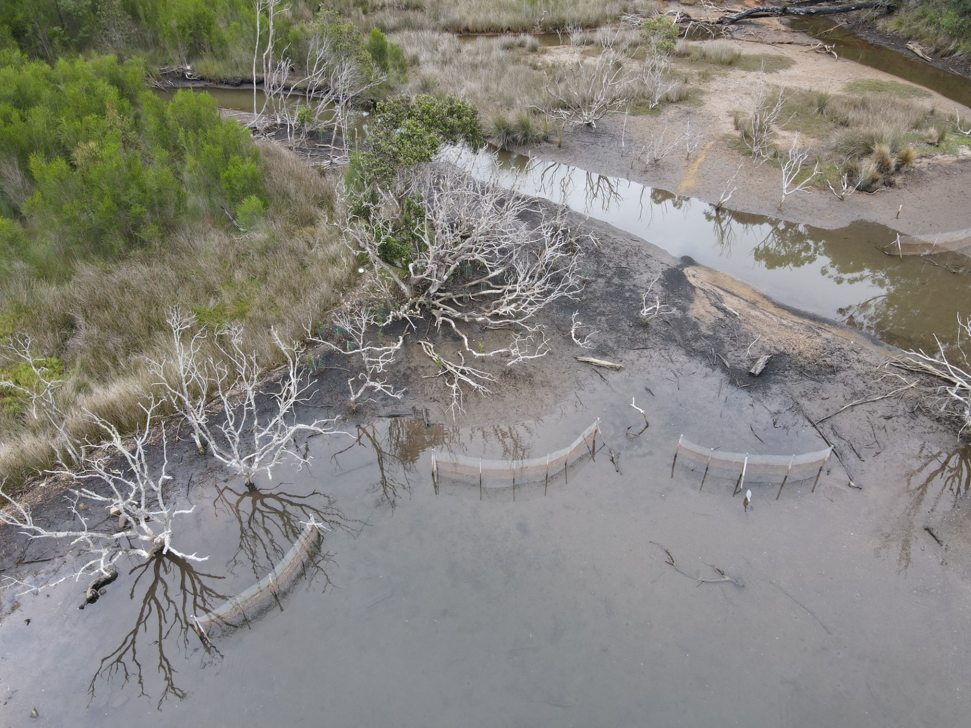 Planting and temporary placement of wave and tree protection on mangroves post 2019 bushfire damage, Wonboyn inlet.